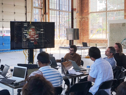 Image 9: M-NEX team developing urban design schemes examining linear urban intensification and implementation of food access instruments during design charrette.(Image © RVTR/ U-M).